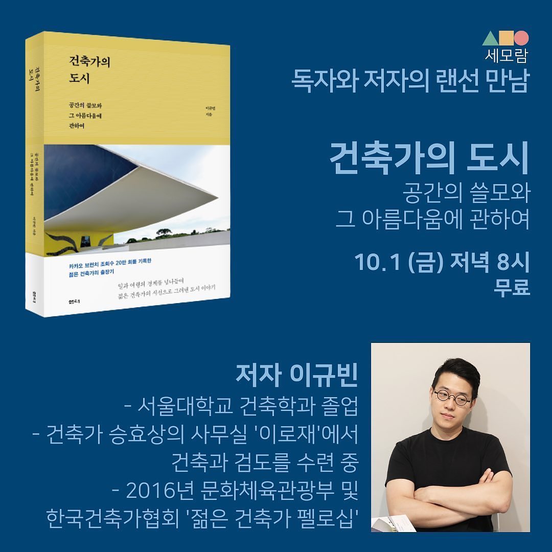 10/1 금요일 저녁 8시 줌(zoom)으로 <건축가의 도시> 온라인 북토크를 진행하게 되었습니다. 무료 행사이며 참가신청은 이곳(https://www.semoram.com/book22)에서 가능합니다. 코로나로 몸도 마음도 모두 억압당한 시대, 온라인 공간에서 더 많은 독자 여러분과 소통할 수 있으면 좋겠습니다! 많은 관심 부탁드려요 :)