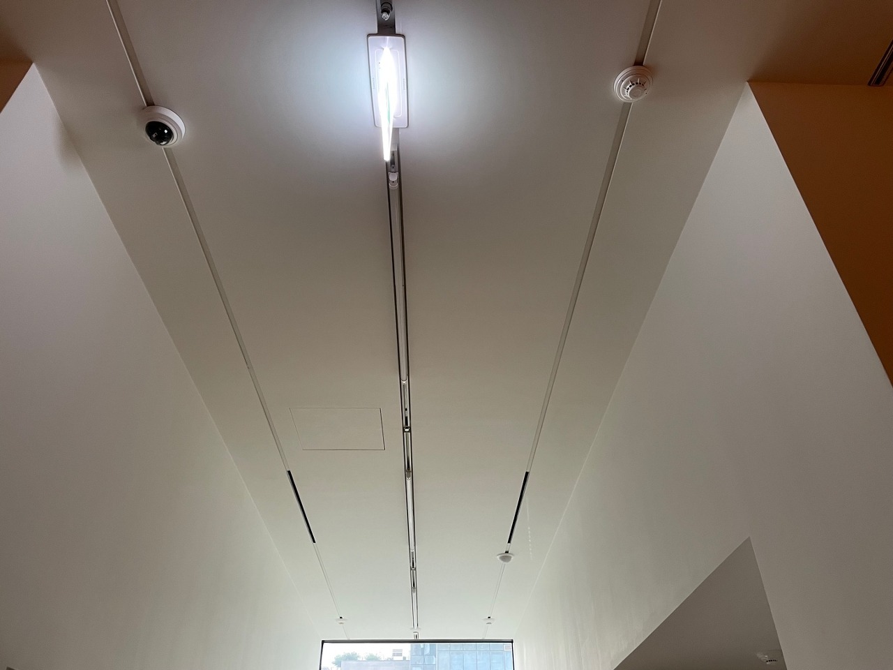 전시실의 천장은 균질한 전반 조도를 확보하고 전시물에 따라 국부조명(spot light)을 대응시킬 수 있도록 긴 레일을 설치하는 게 일반적이다. 이곳 역시 균등하게 분할한 천장의 조명 라인이 있는데 조금 더 신경을 써서 공조를 위한 토출구(라인 디퓨져)도 레일에 숨겨 설치됐다. 뿐만 아니라 스프링클러, 비상구 표지판, 스피커 등 자질구레한 모든 것들 또한 같은 간격으로 줄을 맞춰 배치됐다.