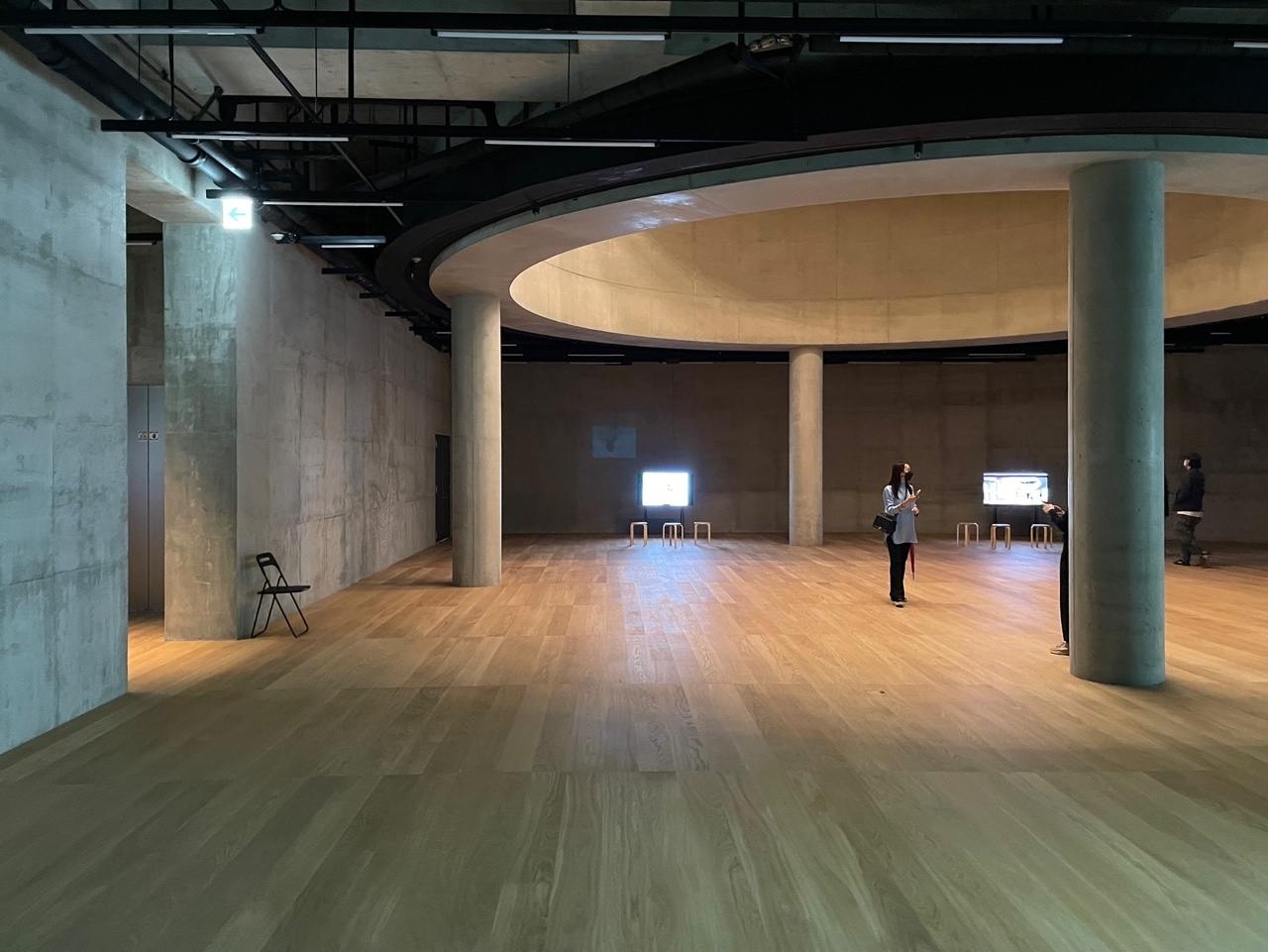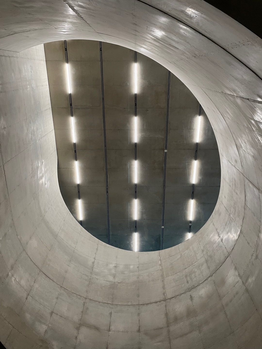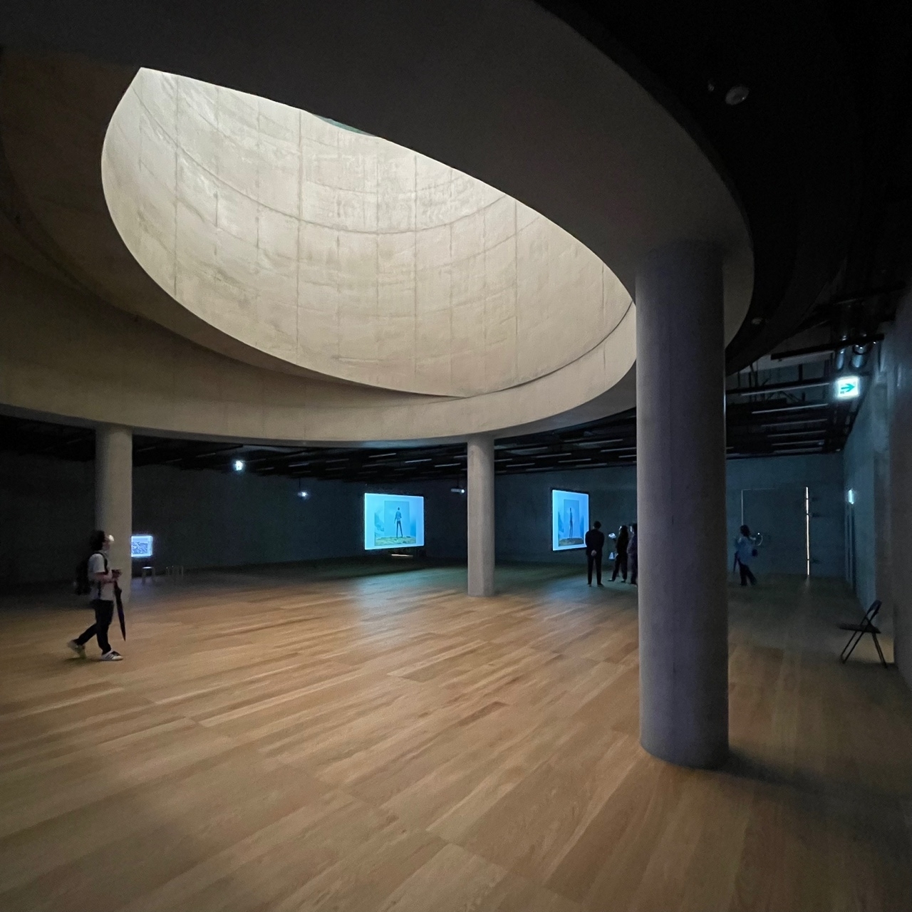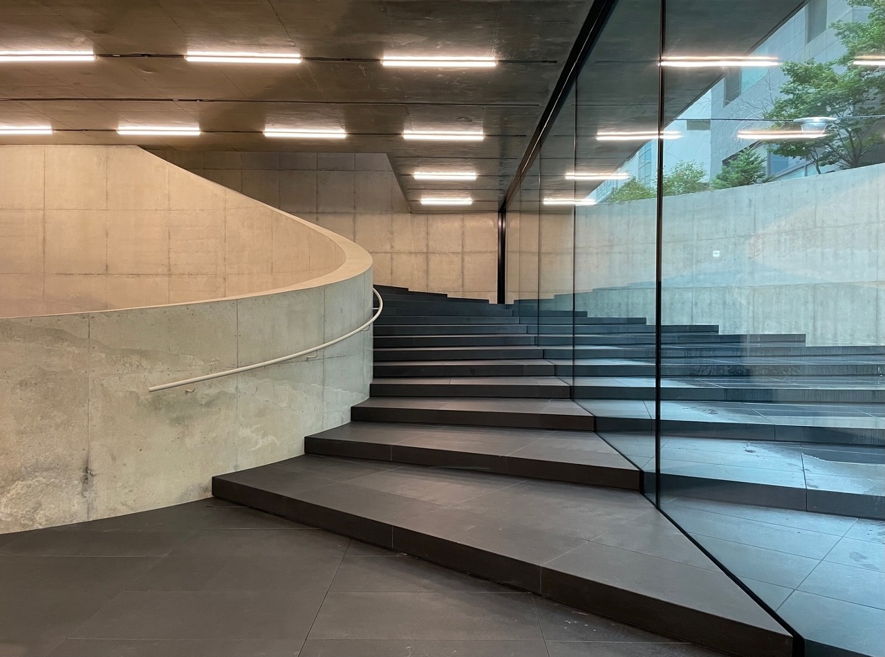 전시의 마지막 순서인 지하 2층에는 조명이 없다. 대신 아트리움을 통해 쏟아져 내려오는 로비 천장의 불빛이 어둠을 밝힌다. 감각적인 조형의 노출 콘크리트 벽면을 훑으며 만들어내는 음영에 많은 사람들이 카메라를 들어 사진을 찍는다. 다만 보통 이런 감동을 주는 공간의 주인공이 자연광인데 반해 이곳은 인공광인게 재미있다. 아, 물론 로비 창문을 통해 들어오는 햇빛이 일부 반사되어 함께 들어오긴 한다.