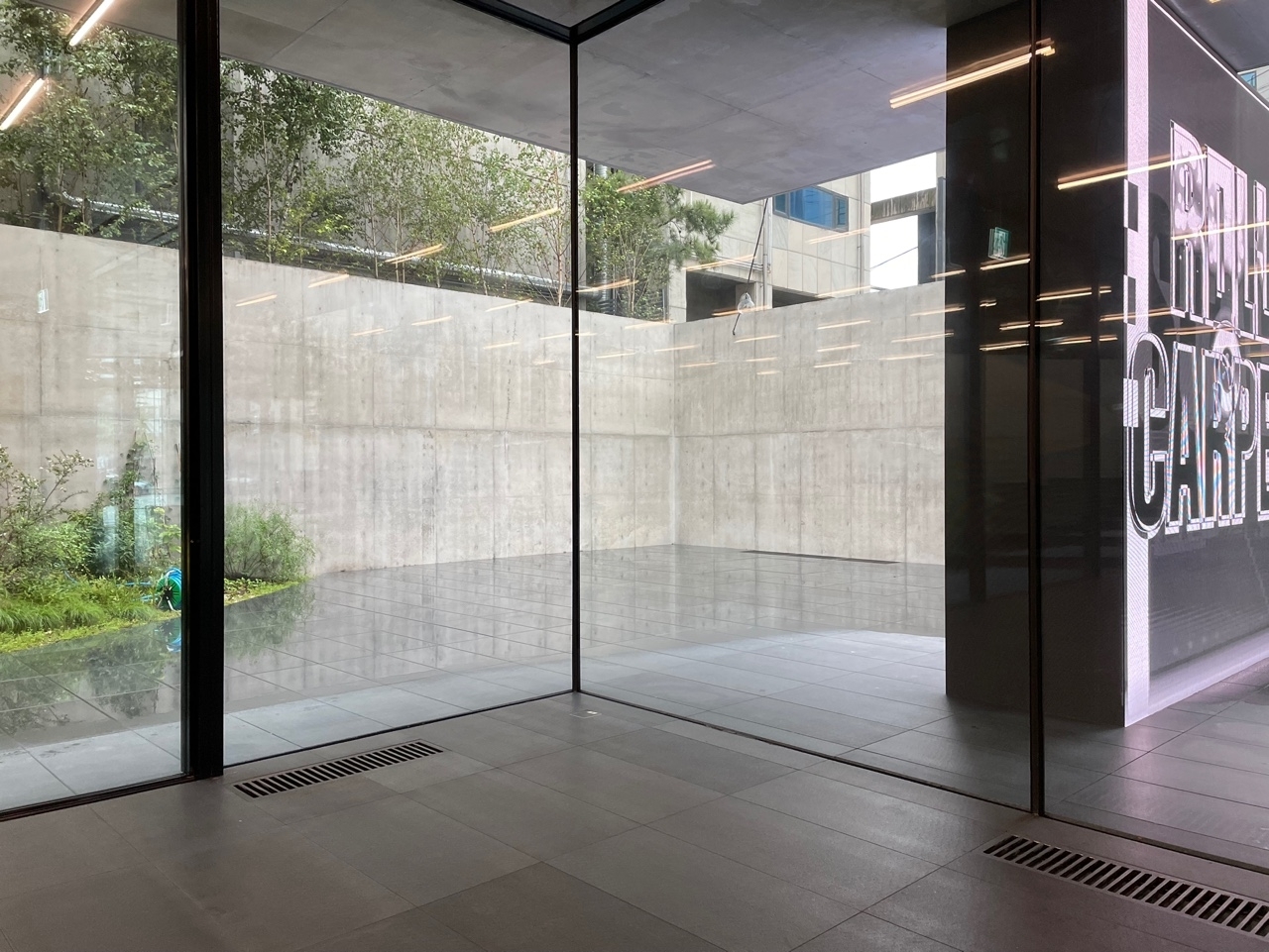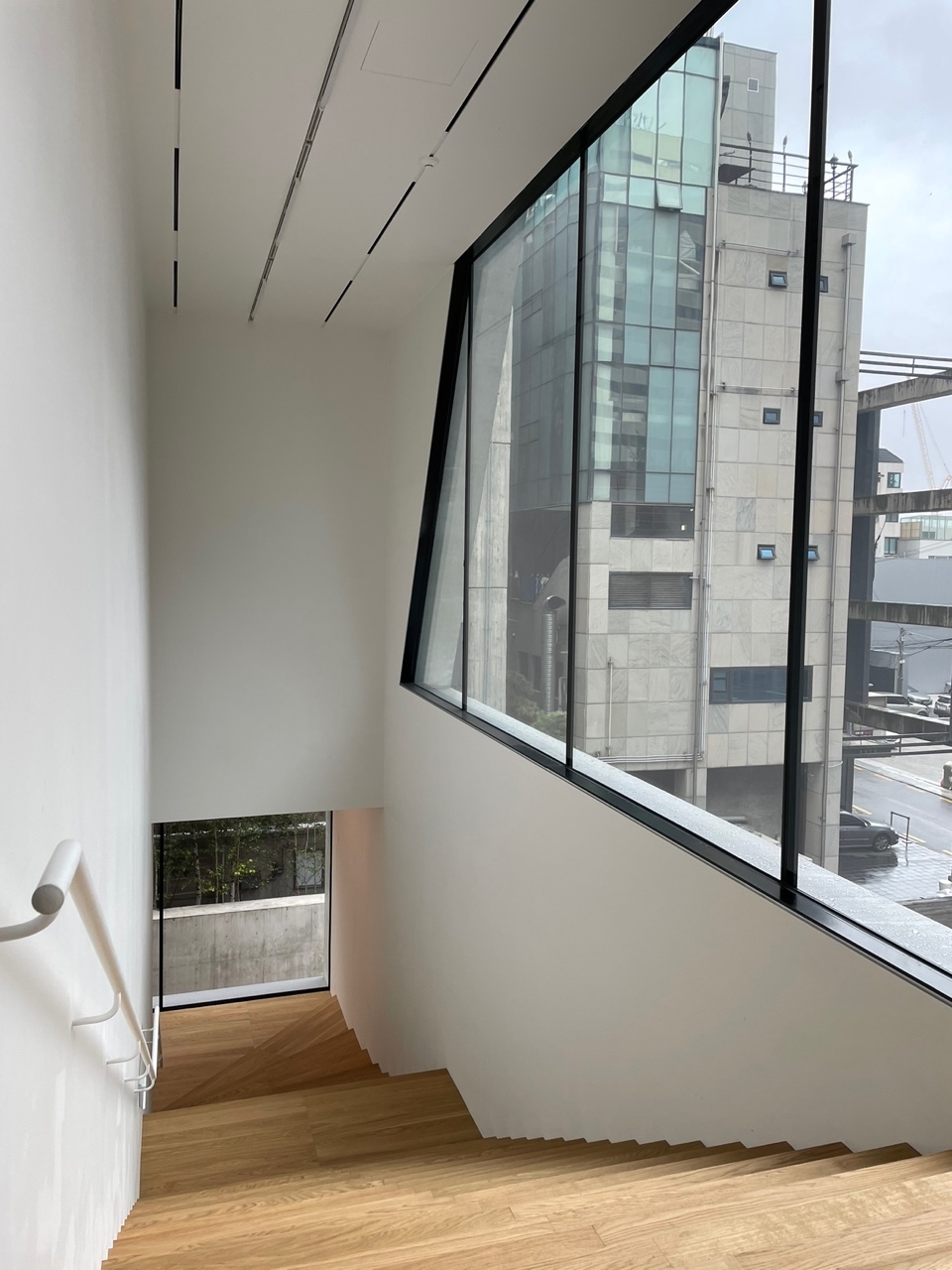 파사드에서 낮은 쪽에 위치한 대로변 7.2m 높이 긴 창은 전시장에서 확인할 수 있다. 남쪽으로 하나뿐인 중요한 창이라 그런지 앞에는 멋진 작품이 놓였다. 아쉬운 점은 창이 있는 쪽이 코어로 되어있어 점검구, 소화전, 엘리베이터, 계단실 문 등 보이지 않았으면 좋았을 것들이 너무 몰려있다는 점이다. 최대한 숨기려는 건축가의 노력이 보였지만 태생적으로 어쩔 수 없는 한계가 있다.